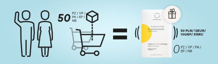 1 pack of the dietary supplement Vitamin C-olway with collagen at the price of 50 PLN / 12 EUR / 10 GBP / 315 KC (without points) for the inviting person.